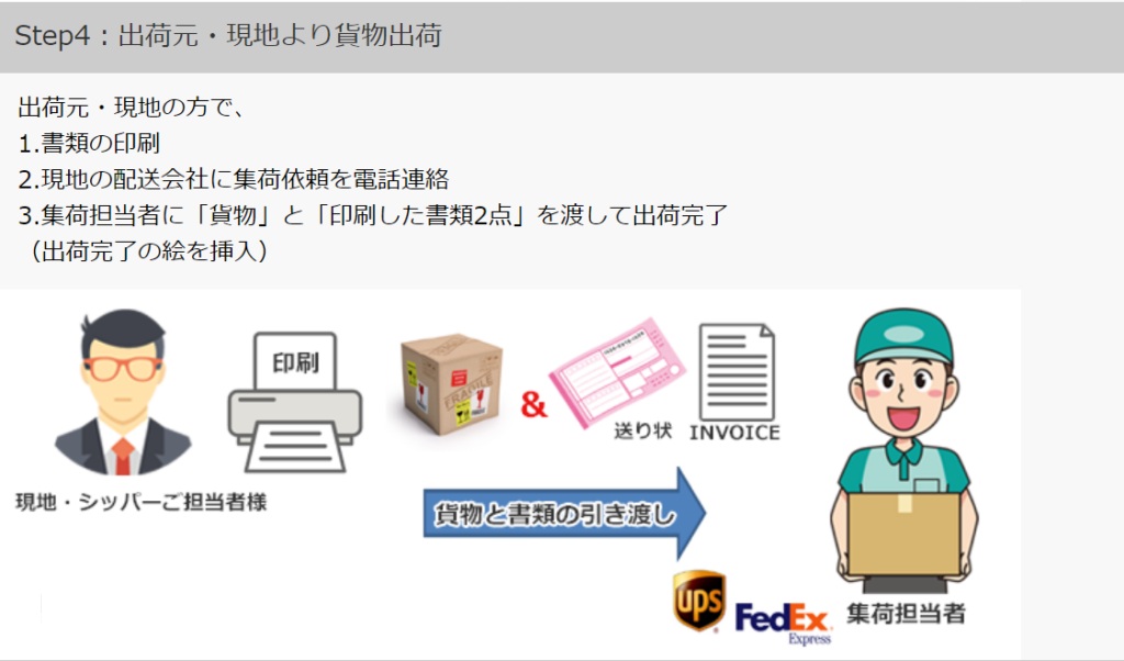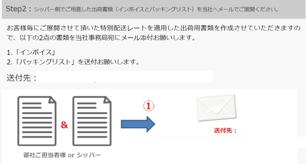 当社より、出荷に必要な書類2点(送り状とインボイス)を御社ご担当者様(またはシッパー)に メール送付します。