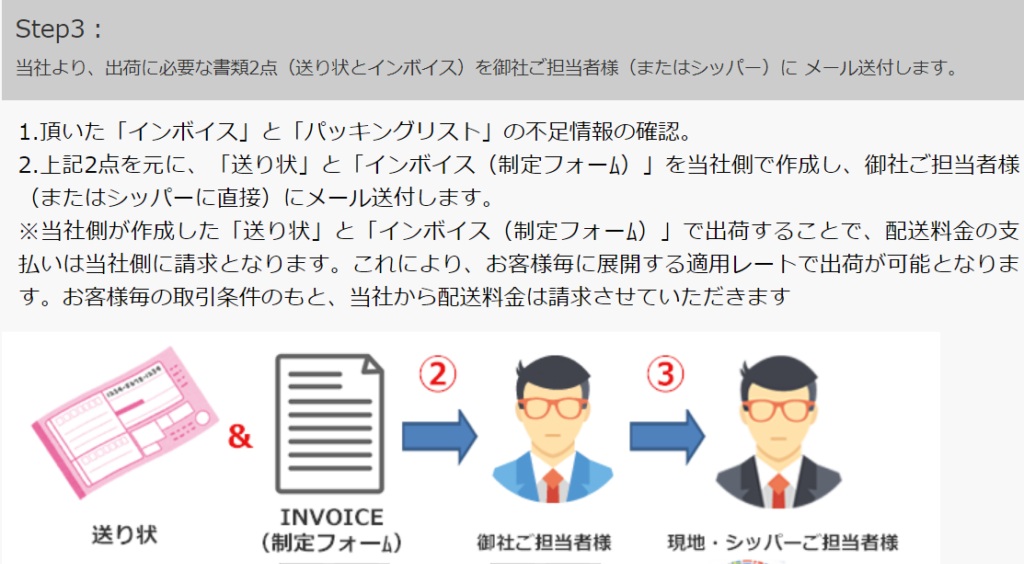 2.上記2点を元に、「送り状」と「インボイス(制定フォーム)」を当社側で作成し、御社ご担当者様(またはシッパーに直接)にメール送付します。